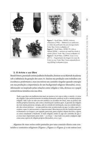 Figura 1 ∙ Ruudt Peters, PASSIO, Antinoüs e Bassianus (1992) — Referencia ao catolicismo e a ideia de purificação das pias de água benta. Fonte: http://www.ruudtpeters.nl/ Figura 2 ∙ Ruudt Peters, SEFIRO TH, Lullus e Nefresh (2006) — estrutura em metal faz alusão à cabala judaica. Fonte: http://www.ruudtpeters.nl/ Figura 3 ∙ Ruudt Peters, CORPUS, Coax e Crus (2011) — fragmentação da imagem do corpo de Cristo na cruz. Fonte: http://www.artjewelryforum. org/ajf-blog/ruudt-peters-corpus