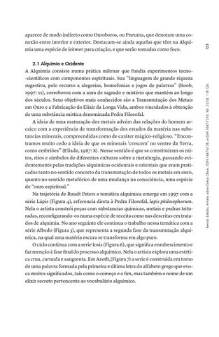 2.1 Alquimia e Ocidente A Alquimia consiste numa prática milenar que fundia experimentos tecno-cientificos com componentes espirituais. Sua “linguagem de grande riqueza sugestiva, pelo recurso a alegorias, homofonias e jogos de palavras” (Roob, 1997: 11), corroborou com a aura de sagrado e mistério que mantém ao longo dos séculos. Seus objetivos mais conhecidos são a Transmutação dos Metais em Ouro e a Fabricação do Elixir da Longa Vida, ambos vinculados à obtenção de uma substância mística denominada Pedra Filosofal. A ideia de uma maturação dos metais advém das relações do homem arcaico com a experiência de transformação dos estados da matéria nas substancias minerais, compreendidas como de caráter mágico-religioso. “Encontramos muito cedo a ideia de que os minerais ‘crescem’ no ventre da Terra, como embriões” (Elíade, 1987: 8). Nesse sentido é que se constituíram os mitos, ritos e símbolos de diferentes culturas sobre a metalurgia, passando evidentemente pelas tradições alquímicas ocidentais e orientais que eram praticadas tanto no sentido concreto da transmutação de todos os metais em ouro, quanto no sentido metafórico de uma mudança na consciência, uma espécie de “ouro espiritual.” Na trajetória de Ruudt Peters a temática alquímica emerge em 1997 com a série Lápis (Figura 4), referencia direta à Pedra Filosofal, lapis philosophorum. Nela o artista constrói peças com substancias químicas, metais e pedras trituradas, reconfigurando-os numa espécie de receita como nas descritas em tratados de alquimia. No ano seguinte ele continua o trabalho nessa temática com a série Albedo (Figura 5), que representa a segunda fase da transmutação alquímica, na qual uma matéria escura se transforma em algo puro. O ciclo continua com a serie Iosis (Figura 6), que significa enrubescimento e faz menção à fase final do processo alquímico. Nela o artista explora uma estética crua, carnuda e sangrenta. Em Azoth,(Figura 7) a serie é construída em torno de uma palavra formada pela primeira e última letra do alfabeto grego que evoca muitos significados, tais como o começo e o fim, mas também o nome de um elixir secreto pertencente ao vocabulário alquímico.