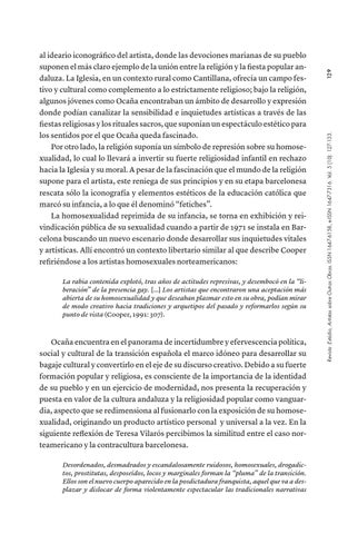 al ideario iconográfico del artista, donde las devociones marianas de su pueblo suponen el más claro ejemplo de la unión entre la religión y la fiesta popular andaluza. La Iglesia, en un contexto rural como Cantillana, ofrecía un campo festivo y cultural como complemento a lo estrictamente religioso; bajo la religión, algunos jóvenes como Ocaña encontraban un ámbito de desarrollo y expresión donde podían canalizar la sensibilidad e inquietudes artísticas a través de las fiestas religiosas y los rituales sacros, que suponían un espectáculo estético para los sentidos por el que Ocaña queda fascinado. Por otro lado, la religión suponía un símbolo de represión sobre su homosexualidad, lo cual lo llevará a invertir su fuerte religiosidad infantil en rechazo hacia la Iglesia y su moral. A pesar de la fascinación que el mundo de la religión supone para el artista, este reniega de sus principios y en su etapa barcelonesa rescata sólo la iconografía y elementos estéticos de la educación católica que marcó su infancia, a lo que él denominó “fetiches”. La homosexualidad reprimida de su infancia, se torna en exhibición y reivindicación pública de su sexualidad cuando a partir de 1971 se instala en Barcelona buscando un nuevo escenario donde desarrollar sus inquietudes vitales y artísticas. Allí encontró un contexto libertario similar al que describe Cooper refiriéndose a los artistas homosexuales norteamericanos: