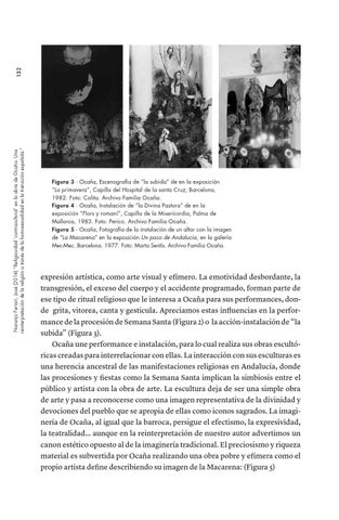 expresión artística, como arte visual y efímero. La emotividad desbordante, la transgresión, el exceso del cuerpo y el accidente programado, forman parte de ese tipo de ritual religioso que le interesa a Ocaña para sus performances, donde grita, vitorea, canta y gesticula. Apreciamos estas influencias en la performance de la procesión de Semana Santa (Figura 2) o la acción-instalación de “la subida” (Figura 3). Ocaña une performance e instalación, para lo cual realiza sus obras escultóricas creadas para interrelacionar con ellas. La interacción con sus esculturas es una herencia ancestral de las manifestaciones religiosas en Andalucía, donde las procesiones y fiestas como la Semana Santa implican la simbiosis entre el público y artista con la obra de arte. La escultura deja de ser una simple obra de arte y pasa a reconocerse como una imagen representativa de la divinidad y devociones del pueblo que se apropia de ellas como iconos sagrados. La imaginería de Ocaña, al igual que la barroca, persigue el efectismo, la expresividad, la teatralidad… aunque en la reinterpretación de nuestro autor advertimos un canon estético opuesto al de la imaginería tradicional. El preciosismo y riqueza material es subvertida por Ocaña realizando una obra pobre y efímera como el propio artista define describiendo su imagen de la Macarena: (Figura 5)