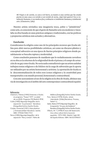 Nuestro artista reivindica una imaginería tosca, pobre y “primitivista” como arte, es consciente de que el gesto de llamarlos arte era moderno y vinculaba su obra basada en unas prácticas antiguas y tradicionales, con las poéticas y propuestas artísticas más actuales y alternativas. Conclusión Consideramos la religión como uno de los principales recursos que Ocaña utiliza para abrir nuevas posibilidades artísticas, así como un discurso plástico y conceptual subversivo en una época de fuertes principios religiosos donde paralelamente se buscaba ruptura y modernidad. Como conclusión ponemos de manifiesto que lo verdaderamente novedoso en su obra es la relectura de la religiosidad desde el prisma y el campo de actuación de un gay como Ocaña. No sería nada contradictorio que un artista andaluz trabajara temas religiosos o de folclore sin la carga de subversión que le aporta ser utilizados por un artista homosexual y activista. La aportación de Ocaña es la descontextualización de todos esos iconos religiosos y la creatividad para transportarlos a un mundo personal, homosexual y contracultural. Con este acercamiento al uso de la religión en la obra de Ocaña, abrimos una vía de investigación en el ámbito del arte contemporáneo contracultural español.