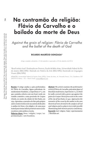 Na contramão da religião: Flávio de Car valho e o bailado da morte de Deus Against the grain of religion: Flávio de Carvalho and the ballet of the death of God Ricardo Maurício Gonzaga* Artigo completo submetido a 14 de setembro e aprovado a 23 de setembro de 2014