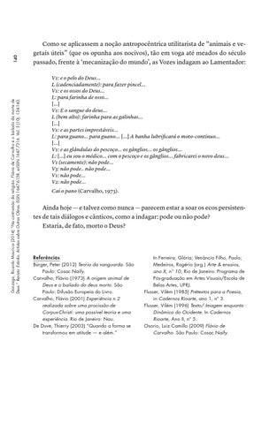 In Ferreira, Glória; Venâncio Filho, Paulo; Medeiros, Rogério (org.) Arte & ensaios, ano X, n° 10, Rio de Janeiro: Programa de Pós-graduação em Artes Visuais/Escola de Belas Artes, UFRJ. Flusser, Vilém (1985) Prétextos para a Poesia, in Cadernos Rioarte, ano 1, nº 3. Flusser, Vilém (1996) Texto/ Imagem enquanto Dinâmica do Ocidente. In Cadernos Rioarte, Ano II, nº 5. Osorio, Luiz Camillo (2009) Flávio de Carvalho. São Paulo: Cosac Naify.
