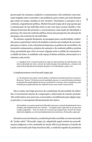 preservação de costumes, tradições e ensinamentos. Ela estabelece uma interação singular entre o narrador e sua audiência, pois o relato, por mais distante que esteja no tempo, atualiza-se nos ouvintes. Vinculamos a narração com a confissão, originalmente pública. Michel Foucault (1999: 58 et seq) aponta que a autenticação de um indivíduo dava-se por seus laços sociais: família e vizinhança forneciam-lhe proteção e, acrescentamos, uma noção de identidade e pertença. Por meio da confissão pública, havia uma perspectiva de salvação de um grupo, não somente de um indivíduo. No entanto, segundo Benjamin, na passagem para a modernidade o indivíduo passa a questionar valores da tradição e mesmo sua condição de ser exemplar para os outros. Com o domínio da imprensa, as práticas de aconselhar e de transmitir ensinamentos, próprias da narração e da confissão pública, perdem força, permitindo que o livro se torne a ligação entre a solidão do romancista e a solidão do leitor. A oralidade cede espaço à leitura solitária, destacando-se o romance, cuja escrita