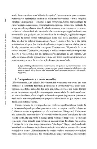 146 França, Cláudia (2014) “Escuta e voz: sobre o ato de confissão no trabalho ‘Escuto Histórias de Amor’ de Ana Teixeira.”