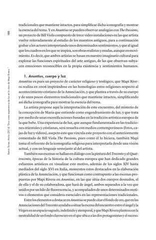 tradicionales que mantiene intactos, para simplificar dicha iconografía y mostrar la esencia del tema. Y en Anuntius se pueden observar analogías con The Passions, un proyecto de Bill Viola compuesto de trece vídeo instalaciones en las que artista vuelve reiteradamente al estudio de los maestros antiguos, para a continuación grabar a los actores interpretando unos determinados sentimientos, y que al igual que los cuadros en los que se inspira, son obras realistas y mudas, aunque en movimiento. Es decir, que ambos artistas se basan en nuestro imaginario cultural para explorar las funciones espirituales del arte antiguo, de las que observan subyacen emociones reconocibles en la propia existencia y sentimientos humanos. 1. Anuntius, cuerpo y luz Anuntius es pues un proyecto de carácter religioso y teológico, que Mapi Rivera realiza en 2006 inspirándose en las homologías entre religiones respecto al acontecimiento cristiano de la Anunciación, y que plantea a través de su cuerpo y de unos pocos elementos tradicionales que mantiene intactos, simplificando así dicha iconografía para mostrar la esencia del tema. La artista propone aquí la interpretación de este encuentro, del misterio de la concepción de Maria que entiende como engendramiento de luz, y que trata por medio de unas escenificaciones basadas en la tradición artística europea de la que bebe. Una experiencia de luz, que aunque fundamentada en las tradiciones orientales y cristianas, será resuelta con medios contemporáneos (fotos, cajas de luz y videos), asepcto este que vincula este proyecto con el anteriormente comentado de Bill Viola The Passions, pues como él lo hiciera, también Mapi toma el referente de la iconografía religiosa para interpretarla desde una visión actual, y con un lenguaje semejante al del artista. También sus escenas se hallan en diálogo con la pintura del Trecento y el Quattrocento, épocas de la historia de la cultura europea que han dedicado grandes esfuerzos artísticos en visualizar este motivo, además de los siglos XIV hasta mediados del siglo XVI en Italia, momentos estos destacados en la elaboración plástica de la Anunciación, y que funcionan como contrapunto a las escenas propuestas por Mapi Rivera en Anuntius, en las que sitúa dos cuerpos desnudos, el de ella y el de su colaboradora, que hará de ángel, ambos separados a la vez que unidos por un hilo de fluorescencia, y acompañados de unos determinados motivos o elementos que considera esenciales en las representaciones tradicionales. Entre los elementos a destacar en Anuntius se puede citar el fondo de oro, que en las Anunciaciones del Trecento ayudaba a situar la escena del encuentro entre el ángel y la Virgen en un espacio sagrado, indefinido y atemporal, y que Mapi Rivera plantea con la neutralidad de un fondo claroscuro en el que ubica a las dos protagonistas y el suceso.