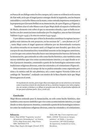 Conclusión Mapi Rivera entiende pues la Anunciación, no solo como hecho histórico, sino también como suceso simbólico que vive como acontecimiento interior, y es aquí donde se sitúa el proyecto Anuntius, construido a partir de las homologías existentes entre las tradiciones religiosas diversas, entre las orientales y el cristianismo. Referencias Rivera, Mapi (2004) “Fragmentos ‘anuntius’ del poemario ilaluzesdeamor”, en Victoria Cirlot y Mapi Rivera (ed.), Mapi Rivera. ISBN: 84-95005-77-8 Rivera, Mapi. Arquivo de imagem. [Consult. 2010-