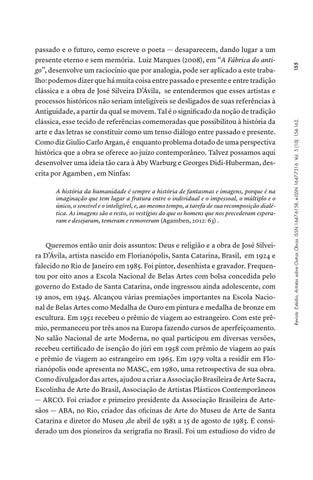 passado e o futuro, como escreve o poeta — desaparecem, dando lugar a um presente eterno e sem memória. Luiz Marques (2008), em “A Fábrica do antigo”, desenvolve um raciocínio que por analogia, pode ser aplicado a este trabalho: podemos dizer que há muita coisa entre passado e presente e entre tradição clássica e a obra de José Silveira D’Ávila, se entendermos que esses artistas e processos históricos não seriam inteligíveis se desligados de suas referências à Antiguidade, a partir da qual se movem. Tal é o significado da noção de tradição clássica, esse tecido de referências comemoradas que possibilitou à história da arte e das letras se constituir como um tenso diálogo entre passado e presente. Como diz Giulio Carlo Argan, é enquanto problema dotado de uma perspectiva histórica que a obra se oferece ao juízo contemporâneo. Talvez possamos aqui desenvolver uma ideia tão cara à Aby Warburg e Georges Didi-Huberman, descrita por Agamben , em Ninfas: