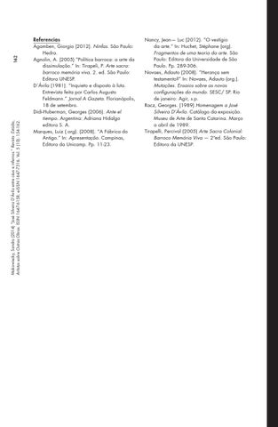 Referencias Agamben, Giorgio (2012). Ninfas. São Paulo: Hedra. Agnolin, A. (2005) “Política barroca: a arte da dissimulação.” In: Tirapeli, P. Arte sacra: barroco memória viva. 2. ed. São Paulo: Editora UNESP. D`Ávila (1981). “Inquieto e disposto à luta. Entrevista feita por Carlos Augusto Feldmann.” Jornal A Gazeta. Florianópolis, 18 de setembro. Didi-Huberman, Georges (2006). Ante el tiempo. Argentina: Adriana Hidalgo editora S. A. Marques, Luiz ( org). (2008). “A Fábrica do Antigo.” In: Apresentação. Campinas, Editora da Unicamp. Pp. 11-23.