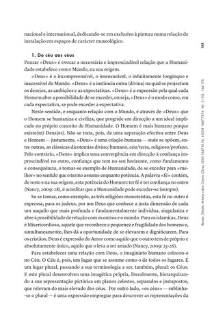 1. Do céu aos céus Pensar «Deus» é evocar a necessária e imprescindível relação que a Humanidade estabelece com o Mundo, na sua origem. «Deus» é o incompreensível, o imensurável, o infinitamente longínquo e inacessível do Mundo. «Deus» é a instância outra (divina) na qual se projectam os desejos, as ambições e as expectativas. «Deus» é a expressão pela qual cada Homem abre a possibilidade de se exceder, ou seja, «Deus» é o modo como, em cada expectativa, se pode exceder a expectativa. Neste sentido, e enquanto relação com o Mundo, é através de «Deus» que o Homem se humaniza e civiliza, que progride em direcção a um ideal implicado no próprio conceito de Humanidade. O Homem é mais humano porque existe(m) Deus(es). Não se trata, pois, de uma separação efectiva entre Deus e Homem — justamente, «Deus» é uma criação humana — onde se opõem, entre outras, as clássicas dicotomias divino/humano, céu/terra, religioso/profano. Pelo contrário, «Deus» implica uma convergência em direcção à confiança imprescindível no outro, confiança que tem no seu horizonte, como fundamento e consequência, o tornar-se exemplo de Humanidade, de se exceder para «melhor» no sentido que o termo assume enquanto potência. A palavra «fé» contém, de resto e na sua origem, esta potência do Homem: ter fé é ter confiança no outro (Nancy, 2009: 28), é acreditar que a Humanidade pode exceder-se (sempre). Se se tomar, como exemplo, as três religiões monoteístas, esta fé no outro é expressa, para os judeus, por um Deus que conhece a justa dimensão de cada um naquilo que mais profunda e fundamentalmente individua, singulariza e abre à possibilidade de relação com os outros e o mundo. Para os islamitas, Deus é Misericordioso, aquele que reconhece a pequenez e fragilidade dos homens e, simultaneamente, lhes dá a oportunidade de se elevarem e dignificarem. Para os cristãos, Deus é expressão do Amor como aquilo que o outro tem de próprio e absolutamente único, aquilo que o leva a ser amado (Nancy, 2009: 25-26). Para estabelecer uma relação com Deus, o imaginário humano colocou-o no Céu. O Céu é, pois, um lugar que se assume como o de todos os lugares. É um lugar plural, passando a sua terminologia a ser, também, plural: os Céus. E este plural desenvolveu uma imagética própria, literalmente, hierarquizando a sua representação pictórica em planos celestes, separados e justapostos, que relevam do mais elevado dos céus. Por outro lado, «os céus» — sublinha-se o plural — é uma expressão empregue para descrever as representações da