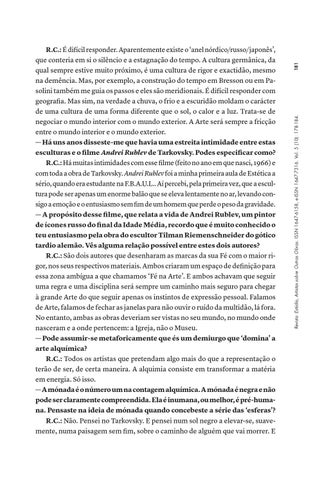 R.C.: É difícil responder. Aparentemente existe o ‘anel nórdico/russo/japonês’, que conteria em si o silêncio e a estagnação do tempo. A cultura germânica, da qual sempre estive muito próximo, é uma cultura de rigor e exactidão, mesmo na demência. Mas, por exemplo, a construção do tempo em Bresson ou em Pasolini também me guia os passos e eles são meridionais. É difícil responder com geografia. Mas sim, na verdade a chuva, o frio e a escuridão moldam o carácter de uma cultura de uma forma diferente que o sol, o calor e a luz. Trata-se de negociar o mundo interior com o mundo exterior. A Arte será sempre a fricção entre o mundo interior e o mundo exterior. — Há uns anos disseste-me que havia uma estreita intimidade entre estas esculturas e o filme Andrei Rublev de Tarkovsky. Podes especificar como? R.C.: Há muitas intimidades com esse filme (feito no ano em que nasci, 1966) e com toda a obra de Tarkovsky. Andrei Rublev foi a minha primeira aula de Estética a sério, quando era estudante na F.B.A.U.L.. Aí percebi, pela primeira vez, que a escultura pode ser apenas um enorme balão que se eleva lentamente no ar, levando consigo a emoção e o entusiasmo sem fim de um homem que perde o peso da gravidade. — A propósito desse filme, que relata a vida de Andrei Rublev, um pintor de ícones russo do final da Idade Média, recordo que é muito conhecido o teu entusiasmo pela obra do escultor Tilman Riemenschneider do gótico tardio alemão. Vês alguma relação possível entre estes dois autores? R.C.: São dois autores que desenharam as marcas da sua Fé com o maior rigor, nos seus respectivos materiais. Ambos criaram um espaço de definição para essa zona ambígua a que chamamos ‘Fé na Arte’. E ambos achavam que seguir uma regra e uma disciplina será sempre um caminho mais seguro para chegar à grande Arte do que seguir apenas os instintos de expressão pessoal. Falamos de Arte, falamos de fechar as janelas para não ouvir o ruído da multidão, lá fora. No entanto, ambas as obras deveriam ser vistas no seu mundo, no mundo onde nasceram e a onde pertencem: a Igreja, não o Museu. — Pode assumir-se metaforicamente que és um demiurgo que ‘domina’ a arte alquímica? R.C.: Todos os artistas que pretendam algo mais do que a representação o terão de ser, de certa maneira. A alquimia consiste em transformar a matéria em energia. Só isso. — A mónada é o número um na contagem alquímica. A mónada é negra e não pode ser claramente compreendida. Ela é inumana, ou melhor, é pré-humana. Pensaste na ideia de mónada quando concebeste a série das ‘esferas’? R.C.: Não. Pensei no Tarkovsky. E pensei num sol negro a elevar-se, suavemente, numa paisagem sem fim, sobre o caminho de alguém que vai morrer. E