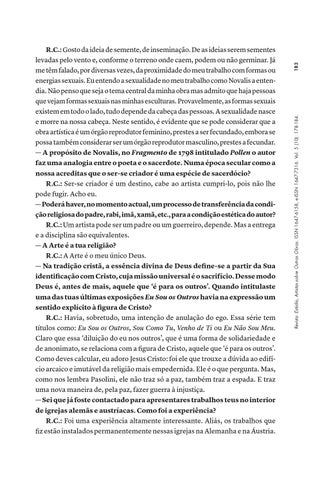 R.C.: Gosto da ideia de semente, de inseminação. De as ideias serem sementes levadas pelo vento e, conforme o terreno onde caem, podem ou não germinar. Já me têm falado, por diversas vezes, da proximidade do meu trabalho com formas ou energias sexuais. Eu entendo a sexualidade no meu trabalho como Novalis a entendia. Não penso que seja o tema central da minha obra mas admito que haja pessoas que vejam formas sexuais nas minhas esculturas. Provavelmente, as formas sexuais existem em todo o lado, tudo depende da cabeça das pessoas. A sexualidade nasce e morre na nossa cabeça. Neste sentido, é evidente que se pode considerar que a obra artística é um órgão reprodutor feminino, prestes a ser fecundado, embora se possa também considerar ser um órgão reprodutor masculino, prestes a fecundar. — A propósito de Novalis, no Fragmento de 1798 intitulado Pollen o autor faz uma analogia entre o poeta e o sacerdote. Numa época secular como a nossa acreditas que o ser-se criador é uma espécie de sacerdócio? R.C.: Ser-se criador é um destino, cabe ao artista cumpri-lo, pois não lhe pode fugir. Acho eu. — Poderá haver, no momento actual, um processo de transferência da condição religiosa do padre, rabi, imã, xamã, etc., para a condição estética do autor? R.C.: Um artista pode ser um padre ou um guerreiro, depende. Mas a entrega e a disciplina são equivalentes. — A Arte é a tua religião? R.C.: A Arte é o meu único Deus. — Na tradição cristã, a essência divina de Deus define-se a partir da Sua identificação com Cristo, cuja missão universal é o sacrifício. Desse modo Deus é, antes de mais, aquele que ‘é para os outros’. Quando intitulaste uma das tuas últimas exposições Eu Sou os Outros havia na expressão um sentido explícito à figura de Cristo? R.C.: Havia, sobretudo, uma intenção de anulação do ego. Essa série tem títulos como: Eu Sou os Outros, Sou Como Tu, Venho de Ti ou Eu Não Sou Meu. Claro que essa ‘diluição do eu nos outros’, que é uma forma de solidariedade e de anonimato, se relaciona com a figura de Cristo, aquele que ‘é para os outros’. Como deves calcular, eu adoro Jesus Cristo: foi ele que trouxe a dúvida ao edifício arcaico e imutável da religião mais empedernida. Ele é o que pergunta. Mas, como nos lembra Pasolini, ele não traz só a paz, também traz a espada. E traz uma nova maneira de, pela paz, fazer guerra à injustiça. — Sei que já foste contactado para apresentares trabalhos teus no interior de igrejas alemãs e austríacas. Como foi a experiência? R.C.: Foi uma experiência altamente interessante. Aliás, os trabalhos que fiz estão instalados permanentemente nessas igrejas na Alemanha e na Áustria.