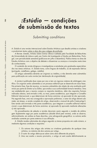 A :Estúdio é uma revista internacional sobre Estudos Artísticos que desafia artistas e criadores a produzirem textos sobre a obra dos seus colegas de profissão. A Revista :Estúdio, Artistas Sobre Outras Obras é editada pela Faculdade de Belas-Artes da Universidade de Lisboa e pelo seu Centro de Investigação e Estudos em Belas-Artes, Portugal, com periodicidade semestral (publica-se em julho e dezembro). Publica temas na área de Estudos Artísticos com o objetivo de debater e disseminar os avanços e inovações nesta área do conhecimento. O conteúdo da revista dirige-se a investigadores e estudantes pós graduados especializados nas áreas artísticas. A :Estúdio toma, como línguas de trabalho, as de expressão ibérica (português, castelhano, galego, catalão). Os artigos submetidos deverão ser originais ou inéditos, e não deverão estar submetidos para publicação em outra revista (ver declaração de originalidade). A revista é publicada duas vezes por ano e tem um rigoroso sistema de arbitragem científica. Os originais serão submetidos a um processo editorial que se desenrola em duas fases. Na primeira fase, fase de resumos, os resumos submetidos são objeto de uma avaliação preliminar por parte do Diretor e/ou Editor, que avalia a sua conformidade formal e temática. Uma vez estabelecido que o resumo cumpre os requisitos temáticos, além dos requisitos formais indicados abaixo, será enviado a três, ou mais, pares académicos, que integram o Conselho Editorial internacional, e que determinam de forma anónima: a) aprovado b) não aprovado. Na segunda fase, uma vez conseguida a aprovação preliminar, o autor do artigo deverá submeter, em tempo, a versão completa do artigo, observando o manual de estilo (‘meta-artigo’). Esta versão será enviada a três pares académicos, que integram o conselho editorial internacional, e que determinam de forma anónima: a) aprovado b) aprovado mediante alterações c) não aprovado. Os procedimentos de seleção e revisão decorrem assim segundo o modelo de arbitragem duplamente cega por pares académicos (double blind peer review), onde se observa, adicionalmente, em ambas as fases descritas, uma salvaguarda geográfica: os autores serão avaliados somente por pares externos à sua afiliação. A :Estúdio recebe submissões de artigos segundo os temas propostos em cada número, e mediante algumas condições e requisitos: 1. Os autores dos artigos são artistas ou criadores graduados de qualquer área artística, no máximo de dois autores por artigo. 2. O autor do artigo debruça-se sobre outra obra diferente da própria. 3. Uma vez aceite o resumo provisório, o artigo só será aceite definitivamente se
