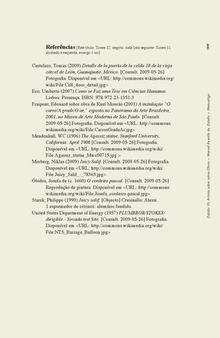 Castelazo, Tomas (2009) Detalle de la puerta de la celda 18 de la vieja cárcel de León, Guanajuato, México. [Consult. 2009-05-26] Fotografia. Disponível em <URL: http://commons.wikimedia.org/ wiki/File:Cell_door_detail.jpg> Eco, Umberto (2007) Como se Faz uma Tese em Ciências Humanas. Lisboa: Presença. ISBN: 978-972-23-1351-3 Fraipont, Edouard sobre obra de Raul Mourão (2001) A instalação “O carro/A grade/O ar,” exposta no Panorama da Arte Brasileira, 2001, no Museu de Arte Moderna de São Paulo. [Consult. 2009-05-26] Fotografia. Disponível em <URL: http://commons. wikimedia.org/wiki/File:CarrosGradeAr.jpg> Mendenhall, WC (1906) The Agassiz statue, Stanford University, California: April 1906 [Consult. 2009-05-26] Fotografia. Disponível em <URL: http://commons.wikimedia.org/wiki/ File:Agassiz_statue_Mwc00715.jpg > Morberg, Niklas (2009) Juicy Salif. [Consult. 2009-05-26] Fotografia. Disponível em <URL: http://commons.wikimedia.org/wiki/ File:Juicy_Salif_-_78365.jpg> Óbidos, Josefa de (c. 1660) O cordeiro pascal. [Consult. 2009-05-26] Reprodução de pintura. Disponível em <URL: http://commons. wikimedia.org/wiki/File:Josefa_cordeiro-pascal.jpg> Starck, Philippe (1990) Juicy salif. [Objecto] Crusinallo: Alessi. 1 espremedor de citrinos: alumínio fundido. United States Department of Energy (1957) PLUMBBOB/STOKES/ dirigible - Nevada test Site. [Consult. 2009-05-26] Fotografia. Disponível em <URL: http://commons.wikimedia.org/wiki/ File:NTS_Barrage_Balloon.jpg>
