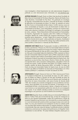 como Investigador e Artista Experimental, tem sido extensivamente divulgado e publicado ao nível internacional (mais informações em www.abarbosa.org). António Delgado (Portugal). Doutor em Belas Artes (escultura) Faculdade de Belas Artes da Universidade do Pais Basco (Espanha). Diploma de Estudos Avançados (Escultura). Universidade do País Basco. Pós graduação em Sociologia do Sagrado, Universidade Nova de Lisboa. Licenciado em Escultura, Faculdade de Belas-Artes da Universidade de Lisboa. Foi diretor do mestrado em ensino de Artes Visuais na Universidade da Beira Interior, Covilhã. Lecionou cursos em várias universidades em Espanha e cursos de Doutoramento em Belas Artes na Universidade do Pais Basco. Como artista plástico, participou em inúmeras exposições, entre colectivas e individuais, em Portugal e no estrangeiro e foi premiado em vários certames. Prémio Extraordinário de Doutoramento em Humanidades, em Espanha. Organizador de congressos sobre Arte e Estética em Portugal e estrangeiro. Membro de comités científicos de congressos internacionais. Da sua produção teórica destacam-se, os titulos “Estetica de la muerte em Portugal” e “Glossário ilustrado de la muerte”, ambos publicados em Espanha. Atualmente é professor coordenador na Escola de Arte e Design das Caldas da Rainha do IPL, onde coordena a licenciatura e o mestrado de Artes Plásticas. Aparecido José Cirillo (Brasil). É pesquisador vinculado ao LEENA-UFES, Laboratório de Extensão e Pesquisa em Artes da Universidade Federal de Espírito Santo (UFES) (grupo de pesquisa em Processo de Criação). Professor Permanente do Programa de Mestrado em Artes da UFES e artista plástico. Possui graduação em Artes pela Universidade Federal de Uberlândia (1990), mestrado em Educação pela Universidade Federal do Espírito Santo (1999) e doutorado em Comunicação e Semiótica pela Pontifícia Universidade Católica de São Paulo (2004). Atualmente é Professor Associado da Universidade Federal do Espírito Santo. Tem experiência na área de Artes, Artes Visuais e Teorias e História da Arte, atuando nos seguintes temas: artes e processos contemporâneos, arte pública e teoria do processo de criação. É editor da Revista Farol (ISSN 1517-7858) e membro do conselho científico da Revista Manuscrítica (ISSN 1415-4498). Foi diretor do Centro de Artes da Universidade Federal do Espírito Santo de maio de 2005 a janeiro de 2008, foi Presidente da Associação de Pesquisadores em Crítica Genética (2008-2011). Atualmente é Pró-reitor de Extensão da UFES. Artur Ramos (Portugal). Nasceu em Aveiro em 1966. Licenciou-se em Pintura na Faculdade de Belas-Artes da Universidade de Lisboa. Em 2001 obteve o grau de Mestre em Estética e filosofia da Arte pela Faculdade de Letras da Universidade de Lisboa. Em 2007 doutorou-se em Desenho pela Faculdade de Belas-Artes da mesma Universidade, onde exerce funções de docente desde 1995. Tem mantido uma constante investigação em torno do Retrato e do Auto-retrato, temas abordados nas suas teses de mestrado, O Auto-retrato ou a Reversibilidade do Rosto, e de doutoramento, Retrato: o Desenho da Presença. O corpo humano e a sua representação gráfica tem sido alvo da sua investigação mais recente. O seu trabalho estende-se também ao domínio da investigação arqueológica e em particular ao nível do desenho de reconstituição. Carlos Tejo (Espanha). Doctor en Bellas Artes por la Universidad Politécnica de Valencia. Profesor Titular de la Universidad de Vigo. Su línea de investigación se bifurca en dos intereses fundamentales: análisis de la performance y estudio de proyectos fotográficos que funcionen como documento de un proceso performativo o como herramienta de la práctica artística que tenga el cuerpo como centro de interés. A su vez, esta orientación en la investigación se ubica en contextos periféricos que desarrollan temáticas relacionadas con aspectos identitarios, de género y transculturales. Bajo este corpus de intereses, ha publicado artículos e impartido conferencias y seminarios en los campos de la performance y la fotografía, fundamentalmente. Es autor del libro: “El cuerpo habitado: fotografía cubana para un