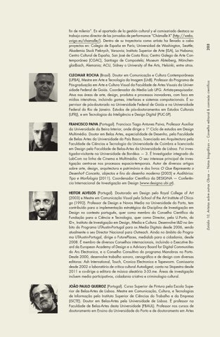 Cleomar Rocha (Brasil). Doutor em Comunicação e Cultura Contemporâneas (UFBA), Mestre em Arte e Tecnologia da Imagem (UnB). Professor do Programa de Pós-graduação em Arte e Cultura Visual da Faculdade de Artes Visuais da Universidade Federal de Goiás. Coordenador do Media Lab UFG. Artista-pesquisador. Atua nas áreas de arte, design, produtos e processos inovadores, com foco em mídias interativas, incluindo games, interfaces e sistemas computacionais. É supervisor de pós-doutorado na Universidade Federal de Goiás e na Universidade Federal do Rio de Janeiro. Estudos de pós-doutoramentos em Estudos Culturais (UFRJ), e em Tecnologias da Inteligência e Design Digital (PUC-SP). Francisco Paiva (Portugal). Francisco Tiago Antunes Paiva, Professor Auxiliar da Universidade da Beira Interior, onde dirige o 1º Ciclo de estudos em Design Multimédia. Doutor em Belas Artes, especialidade de Desenho, pela Faculdade de Belas Artes da Universidade do País Basco, licenciado em Arquitectura pela Faculdade de Ciências e Tecnologia da Universidade de Coimbra e licenciado em Design pela Faculdade de Belas-Artes da Universidade de Lisboa. Foi investigador-visitante na Universidade de Bordéus — 3. É Investigador integrado do LabCom na linha de Cinema e Multimédia. O seu interesse principal de investigação centra-se nos processos espacio-temporais. Autor de diversos artigos sobre arte, design, arquitectura e património e dos livros O Que Representa o Desenho? Conceito, objectos e fins do desenho moderno (2005) e Auditórios: Tipo e Morfologia (2011). Coordenador Científico da DESIGNA — Conferência Internacional de Investigação em Design (www.designa.ubi.pt). Heitor Alvelos (Portugal). Doutorado em Design pelo Royal College of Art (2003) e Mestre em Comunicação Visual pela School of the Art Institute of Chicago (1992). Professor de Design e Novos Media na Universidade do Porto, tem contribuído para a implementação estratégica da Disciplina de Investigação em Design no contexto português, quer como membro do Conselho Científico da Fundação para a Ciência e Tecnologia, quer como Director, pela U.Porto, do ID+, Instituto de Investigação em Design, Media e Cultura. Desenvolve I&D no âmbito do Programa UTAustin-Portugal para os Media Digitais desde 2006, sendo atualmente o seu Director Nacional para Outreach. Ainda no âmbito do Programa UTAustin-Portugal, dirige o FuturePlaces, medialab para a cidadania, desde 2008. É membro de diversos Conselhos internacionais, incluindo o Executive Board da European Academy of Design e o Advisory Board for Digital Communities do Ars Electronica, e o Conselho Consultivo do programa Manobras no Porto. Desde 2000, desenvolve trabalho sonoro, cenográfico e de design com diversas editoras: Ash International, Touch, Cronica Electronica e Tapeworm. Comissaria desde 2002 o laboratório de crítica cultural Autodigest, canta na Stopestra desde 2011 e co-dirige a editora de música aleatória 3-33.me. Áreas de investigação incluem media participativos, cidadania criativa e criminologia cultural. João Paulo Queiroz (Portugal). Curso Superior de Pintura pela Escola Superior de Belas-Artes de Lisboa. Mestre em Comunicação, Cultura, e Tecnologias de Informação pelo Instituto Superior de Ciências do Trabalho e da Empresa (ISCTE). Doutor em Belas-Artes pela Universidade de Lisboa. É professor na Faculdade de Belas-Artes desta Universidade (FBAUL). Professor nos cursos de doutoramento em Ensino da Universidade do Porto e de doutoramento em Artes