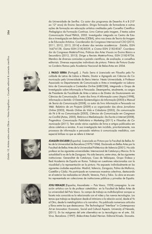 da Universidade de Sevilha. Co autor dos programas de Desenho A e B (10º ao 12º anos) do Ensino Secundário. Dirigiu formação de formadores e outras ações de formação em educação artística creditadas pelo Conselho Científico-Pedagógico da Formação Contínua. Livro Cativar pela imagem, 5 textos sobre Comunicação Visual FBAUL, 2002. Investigador integrado no Centro de Estudos e Investigação em Belas-Artes (CIEBA), ativo nas áreas de Teoria da Imagem e de Educação Artística. Coordenador do Congresso Internacional CSO (2010, 2011, 2012, 2013, 2014) e diretor das revistas académicas :Estúdio, ISSN 1647-6158, Gama ISSN 2182-8539, e Croma ISSN 2182-8547. Coordenador do Congresso Matéria-Prima, Práticas das Artes Visuais no Ensino Básico e Secundário (2012, 2013). Dirige a Revista Matéria-Prima, ISSN 2182-9756. Membro de diversas comissões e painéis científicos, de avaliação, e conselhos editoriais. Diversas exposições individuais de pintura. Prémio de Pintura Gustavo Cordeiro Ramos pela Academia Nacional de Belas-Artes em 2004. J. Paulo Serra (Portugal). J. Paulo Serra é Licenciado em Filosofia pela Faculdade de Letras de Lisboa e Mestre, Doutor e Agregado em Ciências da Comunicação pela Universidade da Beira Interior. Nesta Universidade, é Professor Associado no Departamento de Comunicação e Artes e investigador no Laboratório de Comunicação e Conteúdos On-line (LABCOM), integrando o Grupo de Investigação sobre Informação e Persuasão. Desempenha, atualmente, os cargos de Presidente da Faculdade de Artes e Letras e de Diretor do Doutoramento em Ciências da Comunicação. É autor dos livros A Informação como Utopia (1998), Informação e Sentido: O Estatuto Epistemológico da Informação (2003) e Manual de Teoria da Comunicação (2008), co autor do livro Informação e Persuasão na Web. Relatório de um Projecto (2009) e co organizador das obras Jornalismo Online (2003), Mundo Online da Vida e Cidadania (2003), Da comunicação da Fé à fé na Comunicação (2005), Ciências da Comunicação em Congresso na Covilhã (Actas, 2005), Retórica e Mediatização: Da Escrita à Internet (2008), Pragmática: Comunicação Publicitária e Marketing (2011) e Filosofias da Comunicação (2011). Tem ainda vários capítulos de livros e artigos publicados em obras coletivas e revistas. A sua investigação tem incidido, prioritariamente, nos processos de informação e persuasão relativos à comunicação mediática, com especial ênfase na que se refere à Internet. Joaquín Escuder (Espanha). Licenciado en Pintura por la Facultad de Bellas Artes de la Universidad de Barcelona (1979/1984). Doctorado en Bellas Artes por la Facultad de Bellas Artes de la Universidad Politécnica de Valencia (2001). Ha sido profesor en las siguientes universidades: Internacional de Catalunya y Murcia. En la actualidad lo es de la de Zaragoza. Ha sido becario, entre otras, de las siguientes instituciones: Generalitat de Catalunya, Casa de Velázquez, Grupo Endesa y Real Academia de España en Roma. Trabaja en cuestiones relacionadas con la visualidad y la representación en la pintura. Ha expuesto individualmente en las siguientes ciudades españolas: Madrid, Valencia, Zaragoza, Palma de Mallorca, Castellón y Cádiz. Ha participado en numerosas muestras colectivas, destacando en el exterior las realizadas en Utrecht, Venecia, París y Tokio. Su obra se encuentra representada en colecciones de instituciones públicas y privadas de España. Josu Rekalde (Espanha, Amorebieta — País Vasco, 1959) compagina la creación artística con la de profesor catedrático en la Facultad de Bellas Artes de La universidad del País Vasco. Su campo de trabajo es multidisciplinar aunque su faceta más conocida es la relacionada con el video y las nuevas tecnologías. Los temas que trabaja se desplazan desde el intimismo a la relación social, desde el Yo al Otro, desde lo metalingüístico a lo narrativo. Ha publicado numerosos artículos y libros entre los que destacamos: The Technological “Interface” in Contemporary Art en Innovation: Economic, Social and Cultural Aspects. University of Nevada, (2011). En los márgenes del arte cibernético en Lo tecnológico en el arte.. Ed. Virus. Barcelona. (1997). Bideo-Artea Euskal Herrian. Editorial Kriselu. Donostia.