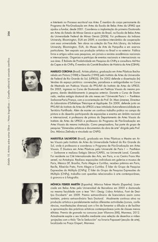 e Intertexto no Processo escritural nas Artes. É membro do corpo permanente do Programa de Pós-Graduação em Artes da Escola de Belas Artes da UFMG que ajudou a fundar, desde 2001. Coordenou a implantação do primeiro Doutorado em Artes do Estado de Minas Gerais e quinto do Brasil, na Escola de Belas Artes da Universidade Federal de Minas Gerais (2006). Foi professora da Indiana University, Bloomington, EUA em 2009, e coordena intercâmbio de cooperação com essa universidade. Tem obras na coleção da Fine Arts Library, da Indiana University, Bloomington, EUA, do Museu de Arte da Pampulha e em acervos particulares. Tem exposto sua produção artística no Brasil e no exterior. Publica livros e artigos sobre suas pesquisas, em jornais e revistas acadêmicas nacionais e internacionais. Organiza e participa de eventos nacionais e internacionais na sua área. É Bolsista de Produtividade em Pesquisa do CNPq e consultora Ad-Hoc da Capes e do CNPq. É membro do Comitê Brasileiro de História da Arte (CBHA). Marilice Corona (Brasil). Artista plástica, graduação em Artes Plásticas Bacharelado em Pintura (1988) e Desenho (1990) pelo Instituto de Artes da Universidade Federal de Rio Grande do Sul, (UFRGS). Em 2002 defende a dissertação (In) Versões do espaço pictórico: convenções, paradoxos e ambiguidades no Curso de Mestrado em Poéticas Visuais do PPG-AVI do Instituto de Artes da UFRGS. Em 2005, ingressa no Curso de Doutorado em Poéticas Visuais do mesmo programa, dando desdobramento à pesquisa anterior. Durante o Curso de Doutorado, realiza estágio doutoral de oito meses em l´Université Paris I — Panthéon Sorbonne-Paris/França, com a co-orientação do Prof. Dr. Marc Jimenez, Directeur du Laboratoire d’Esthétique Théorique et Appliquée. Em 2009, defende junto ao PPG-AVI do Instituto de Artes da UFRGS a tese intitulada Autorreferencialidade em Território Partilhado. Além de manter um contínuo trabalho prático no campo da pintura e do desenho participando de exposições e eventos em âmbito nacional e internacional, é professora de pintura do Departamento de Artes Visuais do Instituto de Artes da UFRGS e professora do Programa de Pós-Graduação em Artes Visuais da mesma instituição. Como pesquisadora, faz parte do grupo de pesquisa “Dimensões artísticas e documentais da obra de arte” dirigido pela Prof. Dra. Mônica Zielinsky e vinculado ao CNPQ. Maristela Salvatori (Brasil), graduada em Artes Plásticas e Mestre em Artes Visuais pelo Instituto de Artes da Universidade Federal do Rio Grande do Sul, onde é professora e coordenou o Programa de Pós-Graduação em Artes Visuais. É Doutora em Artes Plásticas pela Université de Paris I — Panthéon — Sorbonne e realizou Estágio Sênior/CAPES, na Université Laval, Canadá. Foi residente na Cité Internationale des Arts, em Paris, e no Centro Frans Masereel, na Antuérpia. Realizou exposições individuais em galerias e museus de Paris, México DF, Brasília, Porto Alegre e Curitiba, recebeu prêmios em Paris, Recife, Ribeirão Preto, Porto Alegre e Curitiba. É líder do Grupo de Pesquisa Expressões do Múltiplo (CNPq). É líder do Grupo de Pesquisa Expressões do Múltiplo (CNPq), trabalha com questões relacionados à arte contemporânea, à gravura e à fotografia. Mònica Febrer Martín (Espanha). Mònica Febrer Martín (Espanha). Licenciada em Belas Artes pela Universidad de Barcelona em 2005 e doctorada na mesma faculdade com a tese “Art i Desig: L’obra Artística, Font de Desitjos Encoberts” em 2009. Premio extraordinario de licenciatura assim como também, prémio extraordinário Tesis Doctoral. Atualmente continua ativa na produção artística e paralelamente realiza diferentes actividades (cursos, conferências, manifestações diversas) com o fim de fomentar a difusão e de facilitar a aproximação das prácticas artísticas contemporâneas junto de classes menos elitistas. Premio de gravado no concurso Joan Vilanova (XXI), Manresa, 2012. Actualmente expõe o seu trabalho mediante uma seleção de desenhos e vídeo-projeções com o título “De la Seducción” na livraria Papasseit (secção de arte), localizada na Praça Gispert, Manresa.