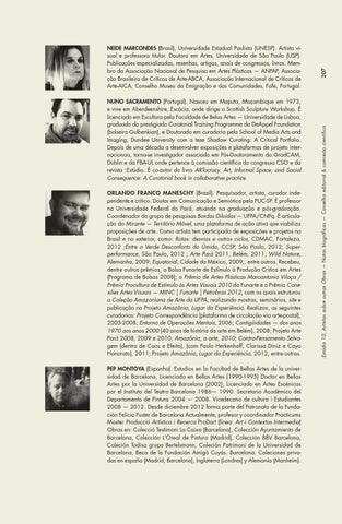 Nuno Sacramento (Portugal). Nasceu em Maputo, Moçambique em 1973, e vive em Aberdeenshire, Escócia, onde dirige o Scottish Sculpture Workshop. É licenciado em Escultura pela Faculdade de Belas Artes — Universidade de Lisboa, graduado do prestigiado Curatorial Training Programme da DeAppel Foundation (bolseiro Gulbenkian), e Doutorado em curadoria pela School of Media Arts and Imaging, Dundee University com a tese Shadow Curating: A Critical Portfolio. Depois de uma década a desenvolver exposições e plataformas de projeto internacionais, torna-se investigador associado em Pós-Doutoramento da GradCAM, Dublin e da FBA-UL onde pertence à comissão científica do congresso CSO e da revista :Estúdio. É co-autor do livro ARTocracy. Art, Informal Space, and Social Consequence: A Curatorial book in collaborative practice. Orlando Franco Maneschy (Brasil). Pesquisador, artista, curador independente e crítico. Doutor em Comunicação e Semiótica pela PUC-SP. É professor na Universidade Federal do Pará, atuando na graduação e pós-graduação. Coordenador do grupo de pesquisas Bordas Diluídas — UFPA/CNPq. É articulação do Mirante — Território Móvel, uma plataforma de ação ativa que viabiliza proposições de arte. Como artista tem participado de exposições e projetos no Brasil e no exterior, como: Rotas: desvios e outros ciclos, CDMAC, Fortaleza, 2012 ;Entre o Verde Desconforto do Úmido, CCSP, São Paulo, 2012; Superperformance, São Paulo, 2012 ; Arte Pará 2011, Belém, 2011; Wild Nature, Alemanha, 2009; Equatorial, Cidade do México, 2009;, entre outros. Recebeu, dentre outros prêmios, a Bolsa Funarte de Estímulo à Produção Crítica em Artes (Programa de Bolsas 2008); o Prêmio de Artes Plásticas Marcantonio Vilaça / Prêmio Procultura de Estímulo às Artes Visuais 2010 da Funarte e o Prêmio Conexões Artes Visuais — MINC | Funarte | Petrobras 2012, com os quais estruturou a Coleção Amazoniana de Arte da UFPA, realizando mostras, seminários, site e publicação no Projeto Amazônia, Lugar da Experiência. Realizou, as seguintes curadorias: Projeto Correspondência (plataforma de circulação via arte-postal), 2003-2008; Entorno de Operações Mentais, 2006; Contigüidades — dos anos 1970 aos anos 2000 (40 anos de história da arte em Belém), 2008; Projeto Arte Pará 2008, 2009 e 2010; Amazônia, a arte, 2010; Contra-Pensamento Selvagem (dentro de Caos e Efeito), (com Paulo Herkenhoff, Clarissa Diniz e Cayo Honorato), 2011; Projeto Amazônia, Lugar da Experiência, 2012, entre outras. Pep Montoya (Espanha). Estudios en la Facultad de Bellas Artes de la universidad de Barcelona, Licenciado en Bellas Artes (1990-1995) Doctor en Bellas Artes por la Universidad de Barcelona (2002), Licenciado en Artes Escénicas por el Instituto del Teatro Barcelona 1986— 1990. Secretario Académico del Departamento de Pintura 2004 — 2008. Vicedecano de cultura i Estudiantes 2008 — 2012. Desde diciembre 2012 forma parte del Patronato de la Fundación Felicia Fuster de Barcelona Actualmente, profesor y coordinador Practicums Master Producció Artística i Recerca ProDart (línea: Art i Contextos Intermedia) Obras en: Colecció Testimoni La Caixa (Barcelona), Colección Ayuntamiento de Barcelona, Colección L’Oreal de Pintura (Madrid), Colección BBV Barcelona, Coleción Todisa grupo Bertelsmann, Coleción Patrimoni de la Universidad de Barcelona, Beca de la Fundación Amigò Cuyás. Barcelona. Coleciones privadas en españa (Madrid, Barcelona), Inglaterra (Londres) y Alemania (Manheim).