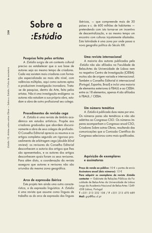 Um número temático Procedimentos de revisão cega A :Estúdio é uma revista de âmbito académico em estudos artísticos. Propõe aos criadores graduados que abordem discursivamente a obra de seus colegas de profissão. O Conselho Editorial aprecia os resumos e os artigos completos segundo um rigoroso procedimento de arbitragem cega (double blind review): os revisores do Conselho Editorial desconhecem a autoria dos artigos que lhes são apresentados, e os autores dos artigos desconhecem quais foram os seus revisores. Para além disto, a coordenação da revista assegura que autores e revisores não são oriundos da mesma zona geográfica.