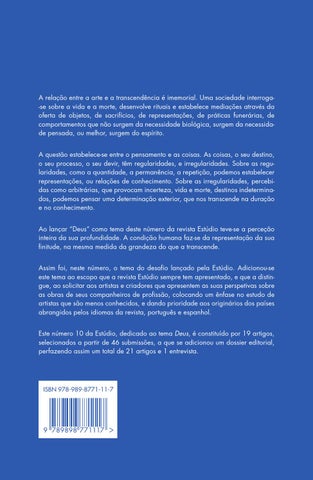 A relação entre a arte e a transcendência é imemorial. Uma sociedade interroga-se sobre a vida e a morte, desenvolve rituais e estabelece mediações através da oferta de objetos, de sacrifícios, de representações, de práticas funerárias, de comportamentos que não surgem da necessidade biológica, surgem da necessidade pensada, ou melhor, surgem do espírito. A questão estabelece-se entre o pensamento e as coisas. As coisas, o seu destino, o seu processo, o seu devir, têm regularidades, e irregularidades. Sobre as regularidades, como a quantidade, a permanência, a repetição, podemos estabelecer representações, ou relações de conhecimento. Sobre as irregularidades, percebidas como arbitrárias, que provocam incerteza, vida e morte, destinos indeterminados, podemos pensar uma determinação exterior, que nos transcende na duração e no conhecimento. Ao lançar “Deus” como tema deste número da revista Estúdio teve-se a perceção inteira da sua profundidade. A condição humana faz-se da representação da sua finitude, na mesma medida da grandeza do que a transcende. Assim foi, neste número, o tema do desafio lançado pela Estúdio. Adicionou-se este tema ao escopo que a revista Estúdio sempre tem apresentado, e que a distingue, ao solicitar aos artistas e criadores que apresentem as suas perspetivas sobre as obras de seus companheiros de profissão, colocando um ênfase no estudo de artistas que são menos conhecidos, e dando prioridade aos originários dos países abrangidos pelos idiomas da revista, português e espanhol. Este número 10 da Estúdio, dedicado ao tema Deus, é constituído por 19 artigos, selecionados a partir de 46 submissões, a que se adicionou um dossier editorial, perfazendo assim um total de 21 artigos e 1 entrevista.