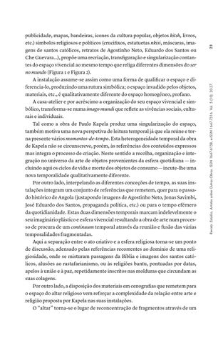 publicidade, mapas, bandeiras, ícones da cultura popular, objetos kitsh, livros, etc.) símbolos religiosos e políticos (crucifixos, estatuetas nkisi, máscaras, imagens de santos católicos, retratos de Agostinho Neto, Eduardo dos Santos ou Che Guevara…), propõe uma recriação, transfiguração e singularização contantes do espaço vivencial ao mesmo tempo que religa diferentes dimensões do ser no mundo (Figura 1 e Figura 2). A instalação assume-se assim como uma forma de qualificar o espaço e diferencia-lo, produzindo uma rutura simbólica; o espaço invadido pelos objetos, materiais, etc., é qualitativamente diferente do espaço homogéneo, profano. A casa-atelier e por acréscimo a organização do seu espaço vivencial e simbólico, transforma-se numa imago mundi que reflete as vivências sociais, culturais e individuais. Tal como a obra de Paulo Kapela produz uma singularização do espaço, também motiva uma nova perspetiva de leitura temporal já que ela reúne e torna presente vários momentos-de-tempo. Esta heterogeneidade temporal da obra de Kapela não se circunscreve, porém, às referências dos conteúdos expressos mas integra o processo de criação. Neste sentido a recolha, organização e integração no universo da arte de objetos provenientes da esfera quotidiana — incluindo aqui os ciclos de vida e morte dos objetos de consumo — incute-lhe uma nova temporalidade qualitativamente diferente. Por outro lado, interpelando as diferentes conceções de tempo, as suas instalações integram um conjunto de referências que remetem, quer para o passado histórico de Angola (justapondo imagens de Agostinho Neto, Jonas Savimbi, José Eduardo dos Santos, propaganda política, etc.) ou para o tempo efémero da quotidianidade. Estas duas dimensões temporais marcam indelevelmente o seu imaginário plástico e esfera vivencial resultando a obra de arte num processo de procura de um continuum temporal através da reunião e fusão das várias temporalidades fragmentadas. Aqui a separação entre o ato criativo e a esfera religiosa torna-se um ponto de discussão, adensado pelas referências recorrentes ao domínio de uma religiosidade, onde se misturam passagens da Bíblia e imagens dos santos católicos, alusões ao rastafarianismo, ou às religiões bantu, pontuadas por datas, apelos à união e à paz, repetidamente inscritos nas molduras que circundam as suas colagens. Por outro lado, a disposição dos materiais em cenografias que remetem para o espaço do altar religioso vem reforçar a complexidade da relação entre arte e religião proposta por Kapela nas suas instalações. O “altar” torna-se o lugar de reconcentração de fragmentos através de um