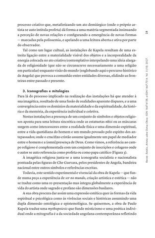 3. Iconografias e mitologias Para lá do processo implicado na realização das instalações há que atender à sua imagética, resultado de uma fusão de realidades aparente díspares, e a uma convergência entre os domínios da materialidade e da espiritualidade, da história e da memória, da experiência individual e coletiva. Nestas instalações a presença de um conjunto de símbolos e objetos religiosos aponta para uma leitura sincrética onde as estatuetas nkisi ou as máscaras surgem como intercessores entre a realidade física e uma dimensão espiritual, entre a vida quotidiana do homem e um mundo povoado pelo espírito dos antepassados; onde o crucifixo cristão assume igualmente um papel de mediador entre o homem e a (omni)presença de Deus. Como vimos, a referência ao campo religioso é complementada com um conjunto de inscrições e colagens onde o autor se auto referencia como profeta ou como papa católico (Figura 3). À imagética religiosa junta-se a uma iconografia socialista e nacionalista pontuada pelas figuras de Che Guevara, pelos presidentes de Angola, bandeira nacional entre outros símbolos e referências escritas. Todavia, este sentido experimental e vivencial da obra de Kapela — que funde numa peça a experiência de ser no mundo, criação artística e estética — não se traduz como uma re-presentação mas integra globalmente a experiência de vida do artista onde sagrado e profano são dimensões basilares. A sua obra procura dar assim uma expressão estética quer às formas da vida espiritual e psicológica como às vivências sociais e históricas assumindo uma dupla dimensão ontológica e epistemológica. Se quisermos, a obra de Paulo Kapela traduz uma mythopoiesis que funde misticismo e uma poética individual onde a mitografia é a da sociedade angolana contemporânea refletindo