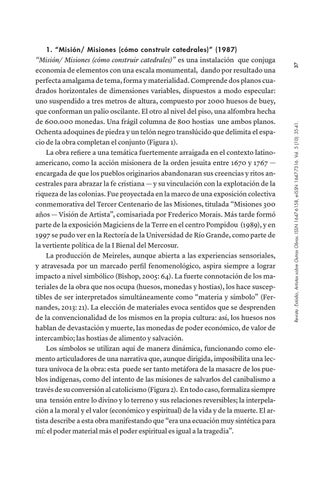 1. “Misión/ Misiones (cómo construir catedrales)” (1987) “Misión/ Misiones (cómo construir catedrales)” es una instalación que conjuga economía de elementos con una escala monumental, dando por resultado una perfecta amalgama de tema, forma y materialidad. Comprende dos planos cuadrados horizontales de dimensiones variables, dispuestos a modo especular: uno suspendido a tres metros de altura, compuesto por 2000 huesos de buey, que conforman un palio oscilante. El otro al nivel del piso, una alfombra hecha de 600.000 monedas. Una frágil columna de 800 hostias une ambos planos. Ochenta adoquines de piedra y un telón negro translúcido que delimita el espacio de la obra completan el conjunto (Figura 1). La obra refiere a una temática fuertemente arraigada en el contexto latinoamericano, como la acción misionera de la orden jesuita entre 1670 y 1767 — encargada de que los pueblos originarios abandonaran sus creencias y ritos ancestrales para abrazar la fe cristiana — y su vinculación con la explotación de la riqueza de las colonias. Fue proyectada en la marco de una exposición colectiva conmemorativa del Tercer Centenario de las Misiones, titulada “Misiones 300 años — Visión de Artista”, comisariada por Frederico Morais. Más tarde formó parte de la exposición Magiciens de la Terre en el centro Pompidou (1989), y en 1997 se pudo ver en la Rectoría de la Universidad de Río Grande, como parte de la vertiente política de la I Bienal del Mercosur. La producción de Meireles, aunque abierta a las experiencias sensoriales, y atravesada por un marcado perfil fenomenológico, aspira siempre a lograr impacto a nivel simbólico (Bishop, 2005: 64). La fuerte connotación de los materiales de la obra que nos ocupa (huesos, monedas y hostias), los hace susceptibles de ser interpretados simultáneamente como “materia y símbolo” (Fernandes, 2013: 21). La elección de materiales evoca sentidos que se desprenden de la convencionalidad de los mismos en la propia cultura: así, los huesos nos hablan de devastación y muerte, las monedas de poder económico, de valor de intercambio; las hostias de alimento y salvación. Los símbolos se utilizan aquí de manera dinámica, funcionando como elemento articuladores de una narrativa que, aunque dirigida, imposibilita una lectura unívoca de la obra: esta puede ser tanto metáfora de la masacre de los pueblos indígenas, como del intento de las misiones de salvarlos del canibalismo a través de su conversión al catolicismo (Figura 2). En todo caso, formaliza siempre una tensión entre lo divino y lo terreno y sus relaciones reversibles; la interpelación a la moral y el valor (económico y espiritual) de la vida y de la muerte. El artista describe a esta obra manifestando que “era una ecuación muy sintética para mí: el poder material más el poder espiritual es igual a la tragedia”.
