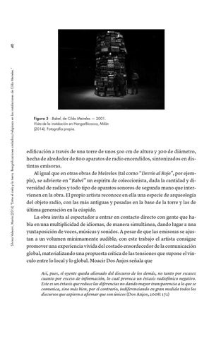 edificación a través de una torre de unos 5oo cm de altura y 300 de diámetro, hecha de alrededor de 800 aparatos de radio encendidos, sintonizados en distintas emisoras. Al igual que en otras obras de Meireles (tal como “Desvío al Rojo”, por ejemplo), se advierte en “Babel” un espíritu de coleccionista, dada la cantidad y diversidad de radios y todo tipo de aparatos sonoros de segunda mano que intervienen en la obra. El propio artista reconoce en ella una especie de arqueología del objeto radio, con las más antiguas y pesadas en la base de la torre y las de última generación en la cúspide. La obra invita al espectador a entrar en contacto directo con gente que habla en una multiplicidad de idiomas, de manera simultánea, dando lugar a una yuxtaposición de voces, músicas y sonidos. A pesar de que las emisoras se ajustan a un volumen mínimamente audible, con este trabajo el artista consigue promover una experiencia vívida del costado ensordecedor de la comunicación global, materializando una propuesta crítica de las tensiones que supone el vínculo entre lo local y lo global. Moacir Dos Anjos señala que Así, pues, el oyente queda alienado del discurso de los demás, no tanto por escasez cuanto por exceso de información, lo cual provoca un éxtasis radiofónico negativo. Este es un éxtasis que reduce las diferencias no dando mayor transparencia a lo que se comunica, sino más bien, por el contrario, indiferenciando en gran medida todos los discursos que aspiren a afirmar que son únicos (Dos Anjos, 2008: 172)