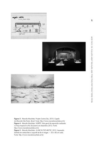Figura 3 ∙ Marcelo Moscheta. Projeto Contra.Céu, 2010. Capela do Morumbi São Paulo, Brasil. Fonte: http://www.marcelomoscheta.art.br Figura 4 ∙ Marcelo Moscheta. NORTE. Vista geral da exposição realizada no Paço Imperial no Rio de Janeiro em dezembro 2012. Fonte: http://www.marcelomoscheta.art.br Figura 5 ∙ Marcelo Moscheta. A LINE IN THE ARCTIC, 2012. Impressão lambda em metacrilato e isopor® set de 4 images — 50 × 80 cm cada. Fonte: http://www.marcelomoscheta.art.br