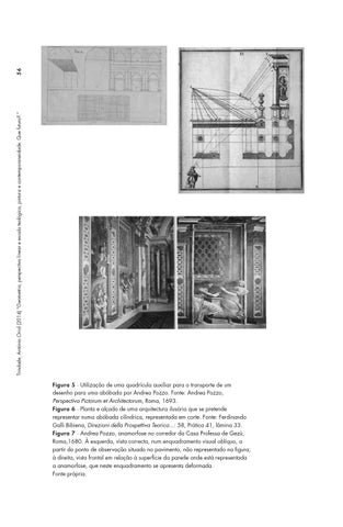 Figura 5 ∙ Utilização de uma quadrícula auxiliar para o transporte de um desenho para uma abóbada por Andrea Pozzo. Fonte: Andrea Pozzo, Perspectiva Pictorum et Architectorum, Roma, 1693. Figura 6 ∙ Planta e alçado de uma arquitectura ilusória que se pretende representar numa abóbada cilíndrica, representada em corte. Fonte: Ferdinando Galli Bibiena, Direzioni della Prospettiva Teorica...: 58, Prática 41, lâmina 33. Figura 7 ∙ Andrea Pozzo, anamorfose no corredor da Casa Professa de Gezù, Roma,1680. À esquerda, vista correcta, num enquadramento visual oblíquo, a partir do ponto de observação situado no pavimento, não representado na figura; à direita, vista frontal em relação à superfície da parede onde está representada a anamorfose, que neste enquadramento se apresenta deformada. Fonte própria.