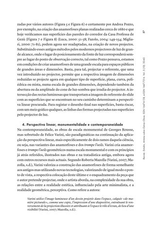 4. Perspectiva linear, monumentalidade e contemporaneidade Na contemporaneidade, as obras de escala monumental de Georges Rousse, mas sobretudo de Felice Varini, são paradigmáticas na continuação da aplicação da perspectiva linear, mais especificamente de dois ramos daquela ciência, ou seja, nas variantes das anamorfoses e dos trompe l’oeils. Varini cria anamorfoses e trompe l’oeils geométricos numa escala monumental e com os princípios já atrás referidos, ilustrados nas obras e na tratadística antiga, embora agora com outros recursos mais actuais. Segundo Roberta Mazolla (Varini, 2007; Mazolla, s.d.), Varini valoriza a construção das anamorfoses de forma semelhante aos antigos mas utilizando novas tecnologias, valorizando de igual modo o ponto de vista, a respectiva colocação deste último e o enquadramento da peça que o autor pretende projectar, onde o artista aborda, na complexidade da sua obra, as relações entre a realidade estética, influenciado pela arte minimalista, e a realidade geométrica, perceptiva. Como refere a autora: Varini utilise l’image lumineuse d’un dessin projetée dans l’espace, calquée «de manière picturale», comme une copie, l’impression d’une diapositive, entraînant le renversement de la projection illusoire et attribuant à l’espace le rôle d’écran, de lieu d’une visibilité (Varini, 2007; Mazolla, s.d.).