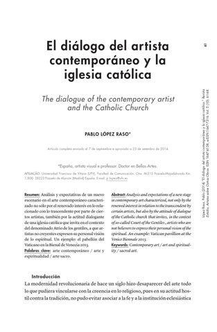 61 López Raso, Pablo (2014) “El diálogo del artista contemporáneo y la iglesia católica.” Revista :Estúdio, Artistas sobre Outras Obras. ISSN 1647-6158, e-ISSN 1647-7316. Vol. 5 (10): 61-68.