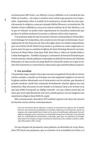 recientemente Bill Viola y sus Mártires (2014) exhibidos en la Catedral de San Pablo en Londres… sin contar a muchos otros artistas que generan en el espectador inquietudes sobre el sentido de la existencia y el más allá sin citar específicamente lo religioso, como por ejemplo Olafur Eliasson y su instalación The Weather Project exhibida en 2003 en la sala de turbinas de la Tate Modern, y en la que el visitante no podía evitar experimentar la romántica melancolía que produce lo sublime mediante la enorme y ardiente esfera solar expuesta. Y no podemos dejar de citar la reciente colectiva comisariada por Gloria Moure en Santiago de Compostela, cuyo asunto no era otro que un homenaje a la peregrinación de San Francisco de Asís ocho siglos atrás a la ciudad compostelana, que con el título On the Road (2014) reunió a 35 artistas en cuatro sugerentes espacios entre los que se contaban la Iglesia de Santo Domingo Bonaval con instalaciones de Mario Merz, Nam June Paik, Roni Horn y videos de Annika Kahrs y Lothar Baumgarten. También el parque y cementerio de Bonaval formaban parte de la muestra, donde podíamos contemplar un árbol de los deseos de Christian Boltansky y la intervención de Jorge Barbi En el final del camino en el que los nichos del cementerio se convertían en colores puros que transformaban el espacio. 2. Una paradoja Y la paradoja surge cuando vemos que esta nueva inquietud observada en ciertos artistas actuales, coincide en el tiempo con otra inquietud surgida en el seno de la iglesia católica relacionada con el reencuentro con los artistas, que durante el periodo moderno citado han rechazado frontalmente relación alguna con esta institución. Muy elocuente en este sentido es la famosa Carta a los Artistas en la que Juan Pablo II proponía un diálogo renovado con una cultura actual que sin tener que crear específicamente arte sacro, puede generar con sus imágenes una experiencia religiosa (Juan Pablo II, 1999). Más recientemente, Benedicto XVI también expresó este deseo de renovar la relación con los artistas contemporáneos: Con este encuentro deseo expresar y renovar la amistad de la Iglesia con el mundo del arte, una amistad consolidada en el tiempo, dado que el cristianismo, desde sus orígenes, ha comprendido bien el valor de las artes y ha utilizado sabiamente los multiformes lenguajes para comunicar su inmutable mensaje de salvación. Esta amistad debe ser continuamente promovida y sostenida, para que sea auténtica y fecunda, adecuada a los tiempos y tenga en cuenta las situaciones y los cambios sociales y culturales (Benedicto XVI, 2009).