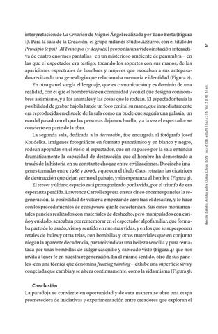 interpretación de La Creación de Miguel Ángel realizada por Tano Festa (Figura 1). Para la sala de la Creación, el grupo milanés Studio Azzurro, con el título In Principio (e poi) [Al Principio (y después)] proponía una videoinstación interactiva de cuatro enormes pantallas –en un misterioso ambiente de penumbra— en las que el espectador era testigo, tocando los soportes con sus manos, de las apariciones espectrales de hombres y mujeres que evocaban a sus antepasados recitando una genealogía que relacionaba memoria e identidad (Figura 2). En otro panel surgía el lenguaje, que es comunicación y es dominio de una realidad, con el que el hombre vive en comunidad y con el que designa con nombres a sí mismo, y a los animales y las cosas que le rodean. El espectador tenía la posibilidad de grabar bajo la luz de un foco cenital su mano, que inmediatamente era reproducida en el suelo de la sala como un bucle que sugería una galaxia, un eco del pasado en el que las personas dejamos huella, y a la vez el espectador se convierte en parte de la obra. La segunda sala, dedicada a la decreación, fue encargada al fotógrafo Josef Koudelka. Imágenes fotográficas en formato panorámico y en blanco y negro, rodean apoyadas en el suelo al espectador, que en su paseo por la sala entendía dramáticamente la capacidad de destrucción que el hombre ha demostrado a través de la historia en su constante choque entre civilizaciones. Dieciocho imágenes tomadas entre 1986 y 2006, y que con el título Caos, retratan las cicatrices de destrucción que dejan yermo el paisaje, y sin esperanza al hombre (Figura 3). El tercer y último espacio está protagonizado por la vida, por el triunfo de esa esperanza perdida. Lawrence Carroll expresa en sus cinco enormes paneles la regeneración, la posibilidad de volver a empezar de cero tras el desastre, y lo hace con los procedimientos de ecos povera que le caracterizan. Sus cinco monumentales paneles realizados con materiales de deshecho, pero manipulados con cariño y cuidado, acababan por rememorar en el espectador algo familiar, que formaba parte de lo usado, visto y sentido en nuestras vidas, y en los que se superponen retales de hules y otras telas, con bombillas y otros materiales que en conjunto niegan la aparente decadencia, para reivindicar una belleza sencilla y pura rematada por unas bombillas de vulgar casquillo y cableado visto (Figura 4) que nos invita a tener fe en nuestra regeneración. En el mismo sentido, otro de sus paneles -con una técnica que denomina freezing painting— exhibe una superficie viva y congelada que cambia y se altera continuamente, como la vida misma (Figura 5).