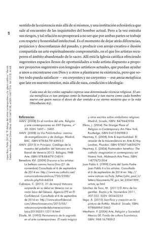 Referencias AAVV. (2008) En el nombre del arte. Religión y arte contemporáneo en EXIT Express, nº 39. ISSN 1697— 5405 AAVV. (2008) La Via Pulchritudinis: camino de evangelización y de dialogo. Madrid, BAC. ISBN 978-84-7914-893-5 AAVV. (2013) In Principio. Catálogo de la muestra del pabellón del Vaticano en la Bienal de Venecia 2013. Bologna, FMRArte. ISBN 978-88-87915-83-9 Benedicto XVI. (2009) Discurso a los artistas: La belleza camino hacia Dios (21 de noviembre) Consultado el 6 de septiembre de 2014 en: http://www.es.catholic.net/ comunicadorescatolicos/730/2300/ articulo.php?id=44224 Cabrejas, C. (2013, 31 de mayo) Vaticano sorprende en su debut en Venecia con su visión laica del Génesis. Agencia EFE en El Confidencial. Consultado el 6 de septiembre de 2014 en: http://www.elconfidencial. com/ultima-hora-en-vivo/2013/05/ vaticano-sorprende-debut-venecia-visionlaica-20130531-153118.html Eliade, M. (1995) Permanencia de lo sagrado en el arte contemporáneo. El vuelo mágico