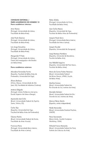 Margarida P. Prieto (Portugal, Universidade de Lisboa, Centro de Investigação e de Estudos em Belas-Artes). Pares académicos externos: Almudena Fernández Fariña (Espanha, Facultad de Bellas Artes de Pontevedra, Universidad de Vigo). Álvaro Barbosa (China, Macau, Universidade de São José, USJ, Faculdade de Indústrias Criativas). António Delgado (Portugal, Intituto Politécnico de Leiria, Escola Superior de Artes e Design).
