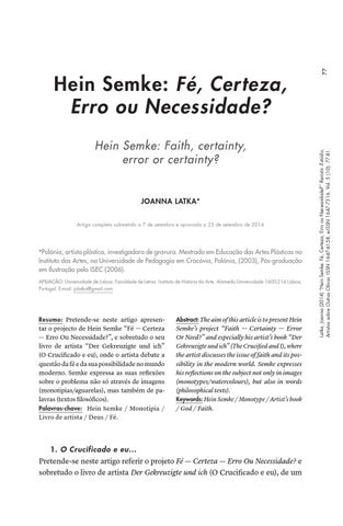 77 Latka, Joanna (2014) “Hein Semke: Fé, Certeza, Erro ou Necessidade?” Revista :Estúdio, Artistas sobre Outras Obras. ISSN 1647-6158, e-ISSN 1647-7316. Vol. 5 (10): 77-81.