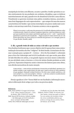 3. Ele, o grande irmão de todas as coisas e de tudo o que acontece Para finalizar lembramos que o nosso objetivo não foi apenas fazer uma contextualização da temática da obra “religiosa” de Hein Semke. Gostaríamos de chamar à atenção para o projeto Fé — Certeza — Erro Ou Necessidade? e sobretudo para o livro Der Gekreuzigte und ich (O Crucificado e eu), que revela, para além do lado filosófico do artista, a sua grande riqueza em áreas menos conhecidas da sua atividade como a Gravura e o Livro de Artista (Semke produziu ao todo 34 livros). Esperamos despertar assim o interesse dos leitores para estas obras, sem dúvida merecedoras de maior atenção. Como artista — como artista estreitamente circunscrito ao individual, apontarei só a minha verdade, a que surgiu dentro de mim, que é, pode ou devia ser mais autêntica do que qualquer chamada verdade histórica. Só existe uma verdade autêntica, a do nosso próprio eu, a da nossa própria vivência — a do meu exclusivo reconhecimento do que acontece dentro de mim. (Semke, 1969, s/p)