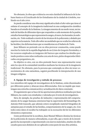 No obstante, la obra que evidencia con más claridad la influencia de la Sabana Santa es el Crucificado de los Estudiantes de la ciudad de Córdoba, realizado en el año 2010. Se puede considerar una obra muy significativa dado el alto valor que tiene al enlazar el concepto de la imaginería tradicional en una configuración científica basada en el estudio de la Síndone. La imagen muestra de un modo veraz, un tratado de heridas de diferentes tipos que responden a cada momento de la pasión, estudios hematológicos que representan la sangre, el suero, los hematíes, la sudoración, etc. Todo realizado a través de las técnicas de la policromía y abalado por expertos en la materia. Todo ello sobre un modelado que no oculta los relieves de las heridas y las deformaciones que se manifiestan en el Sudario de Turín. Juan Miñarro no pretende con su obra provocar conmoción, como puede suscitar la visión de la espalda flagelada de un Cristo de Gregorio Fernández, o los recursos empleados en imágenes del barroco que exaltan los detalles portando postizos como uñas realizadas con asta de toro, pieles desgarradas fabricadas con pergaminos, etc. Su objetivo es otro, con su obra pretende hacer una representación veraz ante los ojos de la comunidad científica mediante las técnicas de la imaginería tradicional. No obstante, para la persona que contempla su obra sin tener conocimientos de esta naturaleza, seguirá percibiendo la interpretación de una imagen religiosa. 4. Equipo de investigación y método de procesos Los miembros del equipo de investigadores de la Síndone, están diseminados por diferentes países y abarcan áreas diferenciadas. Esto no impide que mantengan una estrecha comunicación y actualización de datos constante. El seguimiento que se hace de las aportaciones plásticas realizadas por Juan Miñarro, las cuales son estudiadas y valoradas por el resto de investigadores. Sirva de ejemplo, las pruebas de imitación y representación del comportamiento de la sangre humana estuvieron bajo la supervisión del hematólogo Dr. Antonio Petit Gancedo, que además estuvo recopilando material fotográfico de autopsias para el estudio de las heridas, comportamientos de la sangre, etc. Con todos estos datos el escultor ha trabajado en la recreación fiel de los diferentes elementos a representar. Como profesional de la escultura, Juan Manuel Miñarro domina las técnicas de la policromía de manera sobresaliente, es por ello, que a través de la investigación ha incorporado y experimentado con nuevos materiales, muchos de ellos creados para usos distintos de ser aplicados como parte de una obra artística.