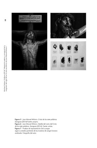 Figura 5 ∙ Juan Manuel Miñarro. Cristo de las siete palabras. Zaragoza (2014) Fuente: propria. Figura 6 ∙ Juan Manuel Miñarro. Detalle del rostro del Cristo de las siete palabras. Zaragoza (2014). Fuente: artista. Figura 7 ∙ Pruebas de representación de la sangre según su estadio partiendo de las muestras de sangre humana analizada. Fotografía del autor.