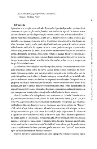 Introdução Quando a arte propõe uma reflexão do mundo é possível perceber quais os limites entre vida, percepção e relações de transcendência, a partir do momento em que se adentra o estado de percepção sobre o outro e seu universo simbólico. O artista paulistano Sinval Garcia (1966-2011) desenvolveu rica obra artística que discute essas percepções entre arte e transcendência durante a construção da série Samsara (1997), tendo parte significativa de sua produção autoral produzida durante a década de 1990 e os anos 2000, período em que viveu em Belém do Pará, no norte do Brasil. Este projeto artístico constitui-se no interstício entre a fotografia e pintura, destacando reflexões acerca da representação, dos limites entre linguagens, bem como deflagra questionamentos sobre o lugar da imagem na cultura visual, amplificando discussões sobre corpo e imagem ao longo da história da arte. As reflexões sobre os limites entre fotografia e pintura são os temas norteadores para um estudo sobre a obra de Sinval Garcia. Entre os seus conteúdos de observação estão composições que transitam entre o exercício do artista sobre um suporte fotográfico manipulável e direcionado para um resultado pré-estabelecido, que transformava suas experiências em expressivas realizações foto-pictóricas. e propõem relacionar uma reflexão do mundo sobre o termo que cede nome à exposição, em que os limites das percepções humanas estão sendo descobertos em experiências sensíveis, e as fotografias discutem o percurso da vida em imagens em que o corpo, com suas tensões e desejos são trabalhados de forma intensa. Sinval Garcia expõe pela primeira vez em Belém na Galeria Theodoro Braga, no subsolo da Fundação Cultural do Pará Tancredo Neves (CENTUR, Belém/PA). A proposta busca desenvolver um trabalho fotográfico que revele as múltiplas instâncias das experiências humanas, a partir do estudo de “deuses” e “demônios” que influenciam os ciclos do Samsara, re-significado, por meio da imagem o conceito que cede nome à exposição, cuja origem vem do sânscrito e significa o ciclo contínuo da vida e da morte para várias filosofias presentes na índia, como o Hinduísmo, o Budismo, etc. O desenvolvimento do Samsara acontece durante os sucessivos renascimentos da alma humana, englobando todos os ciclos do renascimento do “indivíduo” e sua alma, que dependendo de como o sujeito constitui seu percurso, pode torna-se uma “prisão”, um Karma, após os ciclos incessantes de renascimento. Na obra de Sinval Garcia a leitura da alma é proposta com a presença da figura