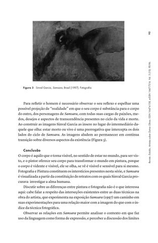 Para refletir o homem é necessário observar o seu reflexo e espelhar uma possível projeção de “realidade” em que o seu corpo é substância para o corpo do outro, dos personagens de Samsara, com todas suas cargas de paixões, medos, desejos e aspectos de transcendência presentes no ciclo da vida e morte. Ao construir as imagens Sinval Garcia as insere no lugar do intermediário daquele que olha: estar morto ou vivo é uma prerrogativa que intercepta os dois lados do ciclo de Samsara. As imagens aludem ao permanecer em contínua transição sobre diversos aspectos da existência (Figura 3). Conclusão O corpo é aquilo que o torna visível, no sentido de estar no mundo, para ser visto, e o pintor oferece seu corpo para transformar o mundo em pintura, porque o corpo é vidente e visível, ele se olha, se vê é visível e sensível para si mesmo. Fotografia e Pintura constituem os interstícios presentes nesta série, e Samsara é visualizada a partir da constituição de retratos com os quais Sinval Garcia procurava investigar a alma humana. Discutir sobre as diferenças entre pintura e fotografia não é o que interessa aqui: cabe falar a respeito das interseções existentes entre as duas técnicas na obra do artista, que experimenta na exposição Samsara (1997) um caminho em suas experimentações para uma relação maior com a imagem do que com o índice da técnica fotográfica. Observar as relações em Samsara permite analisar o contexto em que faz uso da linguagem como forma de expressão, e perceber a discussão dos limites