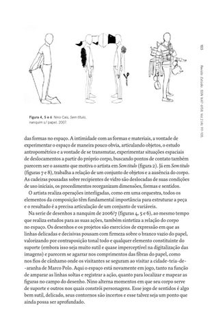 das formas no espaço. A intimidade com as formas e materiais, a vontade de experimentar o espaço de maneira pouco obvia, articulando objetos, o estudo antropométrico e a vontade de se transmutar, experimentar situações espaciais de deslocamentos a partir do próprio corpo, buscando pontos de contato também parecem ser o assunto que motiva o artista em Sem titulo (figura 2). Já em Sem titulo (figuras 7 e 8), trabalha a relação de um conjunto de objetos e a ausência do corpo. As cadeiras pousadas sobre recipientes de vidro são deslocadas de suas condições de uso iniciais, os procedimentos reorganizam dimensões, formas e sentidos. O artista realiza operações interligadas, como em uma orquestra, todos os elementos da composição têm fundamental importância para estruturar a peça e o resultado é a precisa articulação de um conjunto de variáveis. Na serie de desenhos a nanquim de 2006/7 (figuras 4, 5 e 6), ao mesmo tempo que realiza estudos para as suas ações, também sintetiza a relação do corpo no espaço. Os desenhos e os projetos são exercícios de expressão em que as linhas delicadas e decisivas pousam com firmeza sobre o branco vazio do papel, valorizando por contraposição tonal todo e qualquer elemento constituinte do suporte (embora isso seja muito sutil e quase imperceptível na digitalização das imagens) e parecem se agarrar nos comprimentos das fibras do papel, como nos fios de cânhamo onde os visitantes se seguram ao visitar a cidade-teia-de-aranha de Marco Polo. Aqui o espaço está novamente em jogo, tanto na função de amparar as linhas soltas e registrar a ação, quanto para localizar e mapear as figuras no campo do desenho. Nino alterna momentos em que seu corpo serve de suporte e outros nos quais constrói personagens. Esse jogo de sentidos é algo bem sutil, delicado, seus contornos são incertos e esse talvez seja um ponto que ainda possa ser aprofundado.