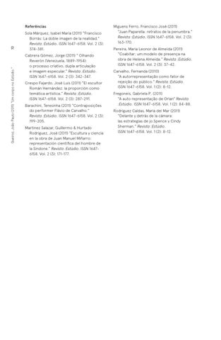 Referências Sola Márquez, Isabel María (2011) “Francisco Borrás: La doble imagen de la realidad.” Revista :Estúdio. ISSN 1647-6158. Vol. 2 (3): 374-381. Cabrera Gómez, Jorge (2011) “ Olhando Reverón (Venezuela, 1889-1954): o processo criativo, dupla articulação e imagem especular.” Revista :Estúdio. ISSN 1647-6158. Vol. 2 (3): 342-347. Crespo Fajardo, José Luis (2011) “El escultor Román Hernández: la proporción como temática artística.” Revista :Estúdio. ISSN 1647-6158. Vol. 2 (3): 287-291. Barachini, Teresinha (2011) “Contraposições do performer Flávio de Carvalho.” Revista :Estúdio. ISSN 1647-6158. Vol. 2 (3): 199-205. Martinez Salazar, Guillermo & Hurtado Rodriguez, José (2011) “Escultura y ciencia en la obra de Juan Manuel Miñarro: representación científica del hombre de la Síndone.” Revista :Estúdio. ISSN 16476158. Vol. 2 (3): 171-177.