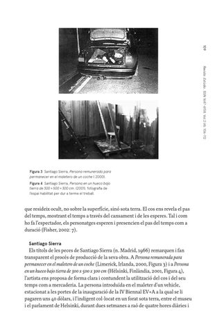Els títols de les peces de Santiago Sierra (n. Madrid, 1966) remarquen i fan transparent el procés de producció de la seva obra. A Persona remunerada para permanecer en el maletero de un coche (Limerick, Irlanda, 2000, Figura 3) i a Persona en un hueco bajo tierra de 300 x 500 x 300 cm (Hèlsinki, Finlàndia, 2001, Figura 4), l’artista ens proposa de forma clara i contundent la utilització del cos i del seu temps com a mercaderia. La persona introduïda en el maleter d’un vehicle, estacionat a les portes de la inauguració de la IV Biennal EV+A a la qual se li pagaren uns 40 dòlars, i l’indigent col·locat en un forat sota terra, entre el museu i el parlament de Helsinki, durant dues setmanes a raó de quatre hores diàries i