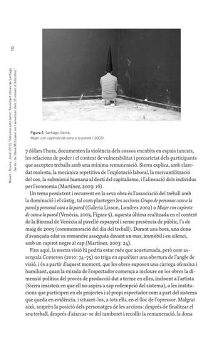 7 dòlars l’hora, documenten la violència dels cossos encabits en espais tancats, les relacions de poder i el context de vulnerabilitat i precarietat dels participants que accepten treballs amb una mínima remuneració. Sierra explica, amb claredat molesta, la mecànica repetitiva de l’explotació laboral, la mercantilització del cos, la submissió humana al destí del capitalisme, i l’alineació dels individus per l’economia (Martínez, 2003: 16). Un tema persistent i recurrent en la seva obra és l’associació del treball amb la dominació i el càstig, tal com plantegen les accions Grupo de personas cara a la pared y personal cara a la pared (Galeria Lisson, Londres 2002) o Mujer con capirote de cara a la pared (Venècia, 2003, Figura 5), aquesta última realitzada en el context de la Biennal de Venècia al pavelló espanyol i sense presència de públic, l’1 de maig de 2003 (commemoració del dia del treball). Durant una hora, una dona d’avançada edat va romandre asseguda davant un mur, immòbil i en silenci, amb un capirot negre al cap (Martínez, 2003: 24). Fins aquí, la nostra visió hi podria estar més que acostumada, però com assenyala Comeron (2010: 74-75) no triga en aparèixer una obertura de l’angle de visió, i és a partir d’aquest moment, que les obres suposen una càrrega ofensiva i humiliant, quan la mirada de l’espectador comença a incloure en les obres la dimensió política del procés de producció dut a terme en elles, incloent a l’artista (Sierra insisteix en que ell no aspira a cap redempció del sistema), a les institucions que participen en els projectes i al propi espectador com a part del sistema que queda en evidència, i situant-los, a tots ells, en el lloc de l’opressor. Malgrat això, sorprèn la posició dels personatges de les accions: després de finalitzar el seu treball, després d’aixecar-se del tamboret i recollir la remuneració, la dona