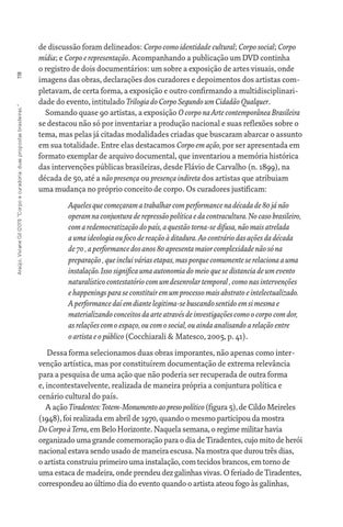 de discussão foram delineados: Corpo como identidade cultural; Corpo social; Corpo mídia; e Corpo e representação. Acompanhando a publicação um DVD continha o registro de dois documentários: um sobre a exposição de artes visuais, onde imagens das obras, declarações dos curadores e depoimentos dos artistas completavam, de certa forma, a exposição e outro confirmando a multidisciplinaridade do evento, intitulado Trilogia do Corpo Segundo um Cidadão Qualquer. Somando quase 90 artistas, a exposição O corpo na Arte contemporânea Brasileira se destacou não só por inventariar a produção nacional e suas reflexões sobre o tema, mas pelas já citadas modalidades criadas que buscaram abarcar o assunto em sua totalidade. Entre elas destacamos Corpo em ação, por ser apresentada em formato exemplar de arquivo documental, que inventariou a memória histórica das intervenções públicas brasileiras, desde Flávio de Carvalho (n. 1899), na década de 50, até a não presença ou presença indireta dos artistas que atribuiam uma mudança no próprio conceito de corpo. Os curadores justificam: Aqueles que começaram a trabalhar com performance na década de 80 já não operam na conjuntura de repressão política e da contracultura. No caso brasileiro, com a redemocratização do país, a questão torna-se difusa, não mais atrelada a uma ideologia ou foco de reação à ditadura. Ao contrário das ações da década de 70 , a performance dos anos 80 apresenta maior complexidade não só na preparação , que inclui várias etapas, mas porque comumente se relaciona a uma instalação. Isso significa uma autonomia do meio que se distancia de um evento naturalístico contestatório com um desenrolar temporal , como nas intervenções e happenings para se constituir em um processo mais abstrato e intelectualizado. A performance daí em diante legitima-se buscando sentido em si mesma e materializando conceitos da arte através de investigações como o corpo com dor, as relações com o espaço, ou com o social, ou ainda analisando a relação entre o artista e o público (Cocchiarali & Matesco, 2005, p. 41). Dessa forma selecionamos duas obras imporantes, não apenas como intervenção artística, mas por constituírem documentação de extrema relevância para a pesquisa de uma ação que não poderia ser recuperada de outra forma e, incontestavelvente, realizada de maneira própria a conjuntura política e cenário cultural do país. A ação Tiradentes: Totem-Monumento ao preso político (figura 5), de Cildo Meireles (1948), foi realizada em abril de 1970, quando o mesmo participou da mostra Do Corpo à Terra, em Belo Horizonte. Naquela semana, o regime militar havia organizado uma grande comemoração para o dia de Tiradentes, cujo mito de herói nacional estava sendo usado de maneira escusa. Na mostra que durou três dias, o artista construiu primeiro uma instalação, com tecidos brancos, em torno de uma estaca de madeira, onde prendeu dez galinhas vivas. O feriado de Tiradentes, correspondeu ao último dia do evento quando o artista ateou fogo às galinhas,