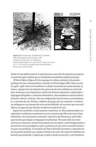diante de uma platéia imóvel. A ação provocou uma série de protestos na imprensa, protestos que também que se estenderam aos plenários políticos do país. O Nervo Óptico (figura 6) foi um grupo de artistas voltados à discussão e produção de arte contemporânea, atuando em Porto Alegre (RS) entre os anos de 1976 e 1978. Entre um manifesto e a edição mensal de um cartaz durante 13 meses, o grupo teve um impacto não apenas local, mas também no centro do país, sendo que seus integrantes realizaram diversas exposições, explorando a linguagem fotográfica e materiais alternativos. Suas temáticas eram reconhecidamente críticas e irônicas. Em sua configuração inicial atacava, principalmente, o mercado de arte. Porém, o objetivo do grupo não era contestar o comércio ou enfraquecer um sistema das artes recém definido, ele recusava que mercado ditasse as regras do que deveria ser feito em matéria de arte. À guisa de conclusão, os dois projetos curatoriais, as obras apresentadas e as exposições resultantes mostraram em seus recortes específicos do tema Corpo, delineados, em um primeiro momento, como foi o da Panorama 97, pelo enfraquecimento que atingia as linguagens tradicionais. Por outro lado um outro sintoma se anunciava, através da produção de um sujeito-artista fragmentado, à procura de novos paradigmas e que encontrava em seu estar no mundo elementos para sua produção. A curadoria de Tadeu Chiarelli encontrou a expressão de um momento pontual, que rompia os limites da carne (de maneira simbólica ou factual) apresentando o zeitgeist que rondava, desde os anos 60, a arte brasileira.