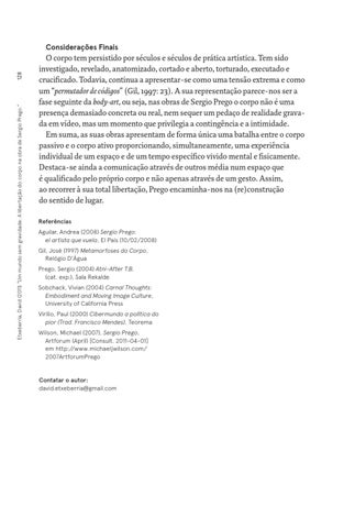 O corpo tem persistido por séculos e séculos de prática artística. Tem sido investigado, revelado, anatomizado, cortado e aberto, torturado, executado e crucificado. Todavia, continua a apresentar-se como uma tensão extrema e como um “permutador de códigos” (Gil, 1997: 23). A sua representação parece-nos ser a fase seguinte da body-art, ou seja, nas obras de Sergio Prego o corpo não é uma presença demasiado concreta ou real, nem sequer um pedaço de realidade gravada em vídeo, mas um momento que privilegia a contingência e a intimidade. Em suma, as suas obras apresentam de forma única uma batalha entre o corpo passivo e o corpo ativo proporcionando, simultaneamente, uma experiência individual de um espaço e de um tempo específico vivido mental e fisicamente. Destaca-se ainda a comunicação através de outros média num espaço que é qualificado pelo próprio corpo e não apenas através de um gesto. Assim, ao recorrer à sua total libertação, Prego encaminha-nos na (re)construção do sentido de lugar. Referências Aguilar, Andrea (2008) Sergio Prego: el artista que vuela, El País (10/02/2008) Gil, José (1997) Metamorfoses do Corpo, Relógio D’Água Prego, Sergio (2004) Atni-After T.B. (cat. exp.), Sala Rekalde Sobchack, Vivian (2004) Carnal Thoughts: Embodiment and Moving Image Culture, University of California Press Virilio, Paul (2000) Cibermundo a política do pior (Trad. Francisco Mendes), Teorema Wilson, Michael (2007), Sergio Prego, Artforum (April) [Consult. 2011‑04‑01] em http://www.michaeljwilson.com/ 2007ArtforumPrego